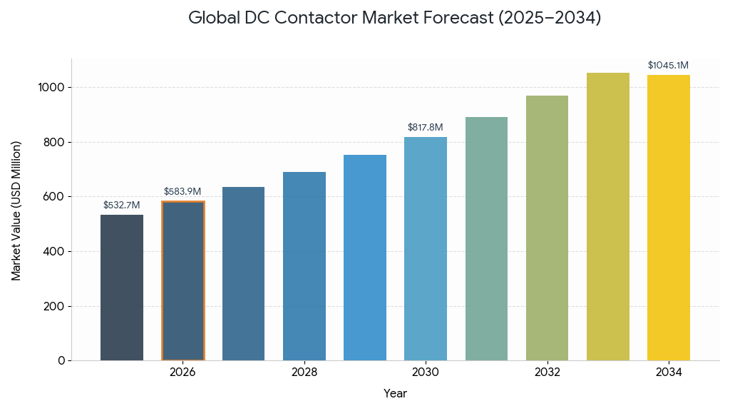 포춘 비즈니스 인사이트에 따르면, 전 세계 DC 접촉기 시장은 전기 부품 산업 내에서 역동적이고 빠르게 성장하는 분야입니다. 2025년 5억 3,273만 달러 규모였던 이 시장은 2034년까지 10억 4,506만 달러에 이르며, 예측 기간 동안 연평균 8.79%의 성장률을 보일 것으로 예상됩니다. 이러한 성장세는 다양한 산업 분야에서 직류 시스템의 채택이 증가하고 있으며, 지속 가능한 에너지 솔루션으로의 세계적인 전환 추세를 반영합니다.