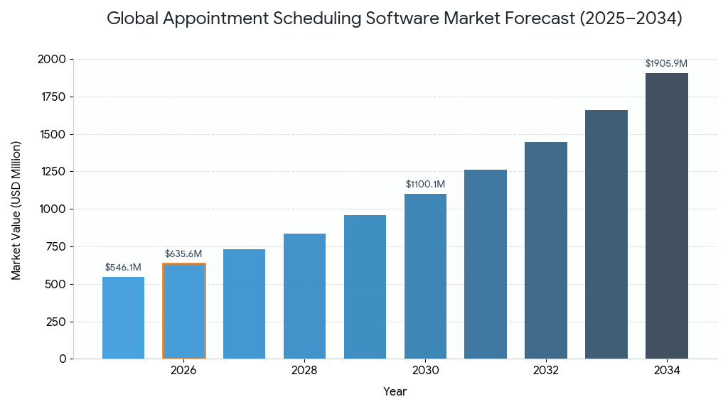 포춘 비즈니스 인사이트에 따르면, 전 세계 예약 관리 소프트웨어 시장은 운영 효율성 향상과 고객 경험 개선을 추구하는 기업의 변화하는 요구를 충족하는 역동적이고 빠르게 성장하는 기술 분야입니다. 2025년 5억 4,610만 달러 규모였던 이 시장은 2026년 6억 3,560만 달러에서 2034년 19억 590만 달러로 성장할 것으로 예상되며, 예측 기간 동안 연평균 14.70%의 성장률을 보일 것으로 전망됩니다. 이러한 견실한 성장세는 여러 산업 분야에서 비즈니스 운영의 디지털화가 가속화되고 자동화된 예약 솔루션으로의 전환이 촉진되고 있음을 반영합니다.
