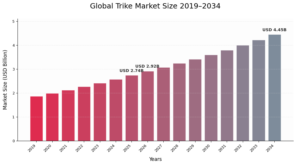 포춘 비즈니스 인사이트에 따르면, 전 세계 삼륜차 시장은 광범위한 파워스포츠 및 개인 이동 수단 산업 내에서 특수 부문을 형성하며, 오토바이의 개방된 도로 주행 경험과 자동차 플랫폼의 향상된 안정성 및 편안함을 결합한 제품입니다. 2025년 27억 4천만 달러 규모였던 이 시장은 2034년까지 44억 5천만 달러로 성장할 것으로 예상되며, 예측 기간 동안 연평균 5.39%의 성장률을 보일 것으로 전망됩니다. 이러한 성장세는 고령화된 운전자 인구 증가, 레저 관광 확대, 그리고 새롭게 부상하는 도시 이동 수단에 대한 수요 증가 등 여러 요인에 힘입어 기존 이륜 오토바이보다 안전하고 편안한 대안에 대한 소비자 관심이 높아지고 있음을 반영합니다.